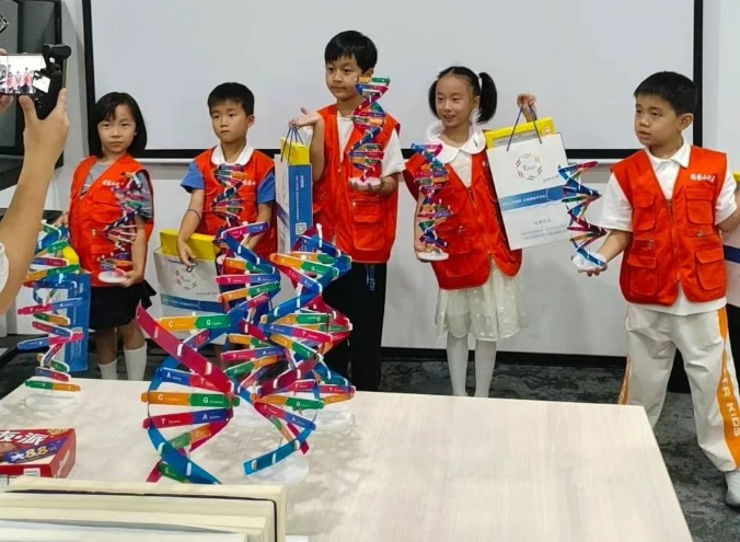活动现场超热闹!抢答环节,小手举得一个比一个高;DNA 模型拼装时,小朋友们化身 “基因小工匠”,用彩色零件模拟体验ATCG剪辑配对,亲手拼出神秘的基因链。